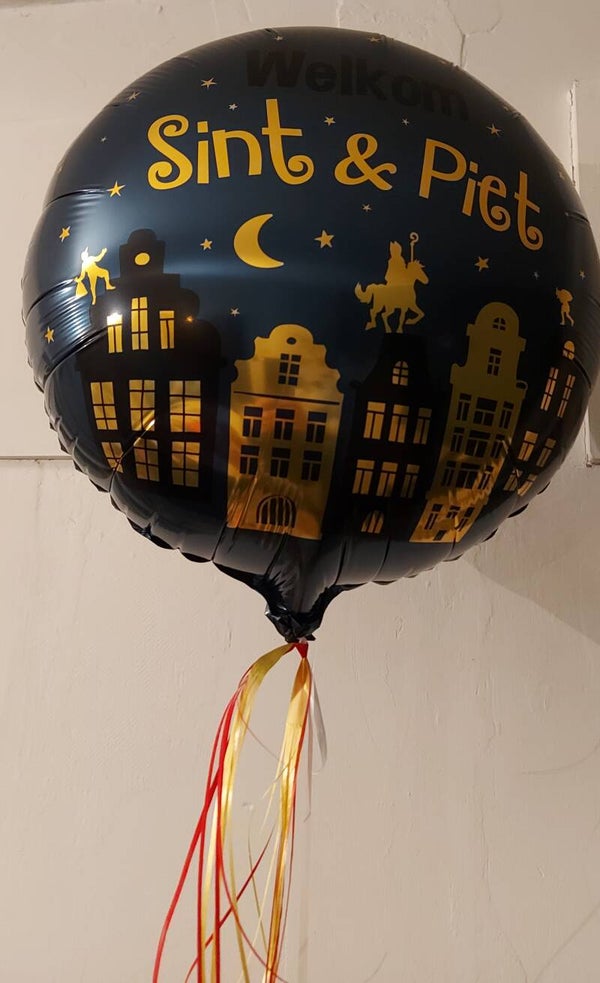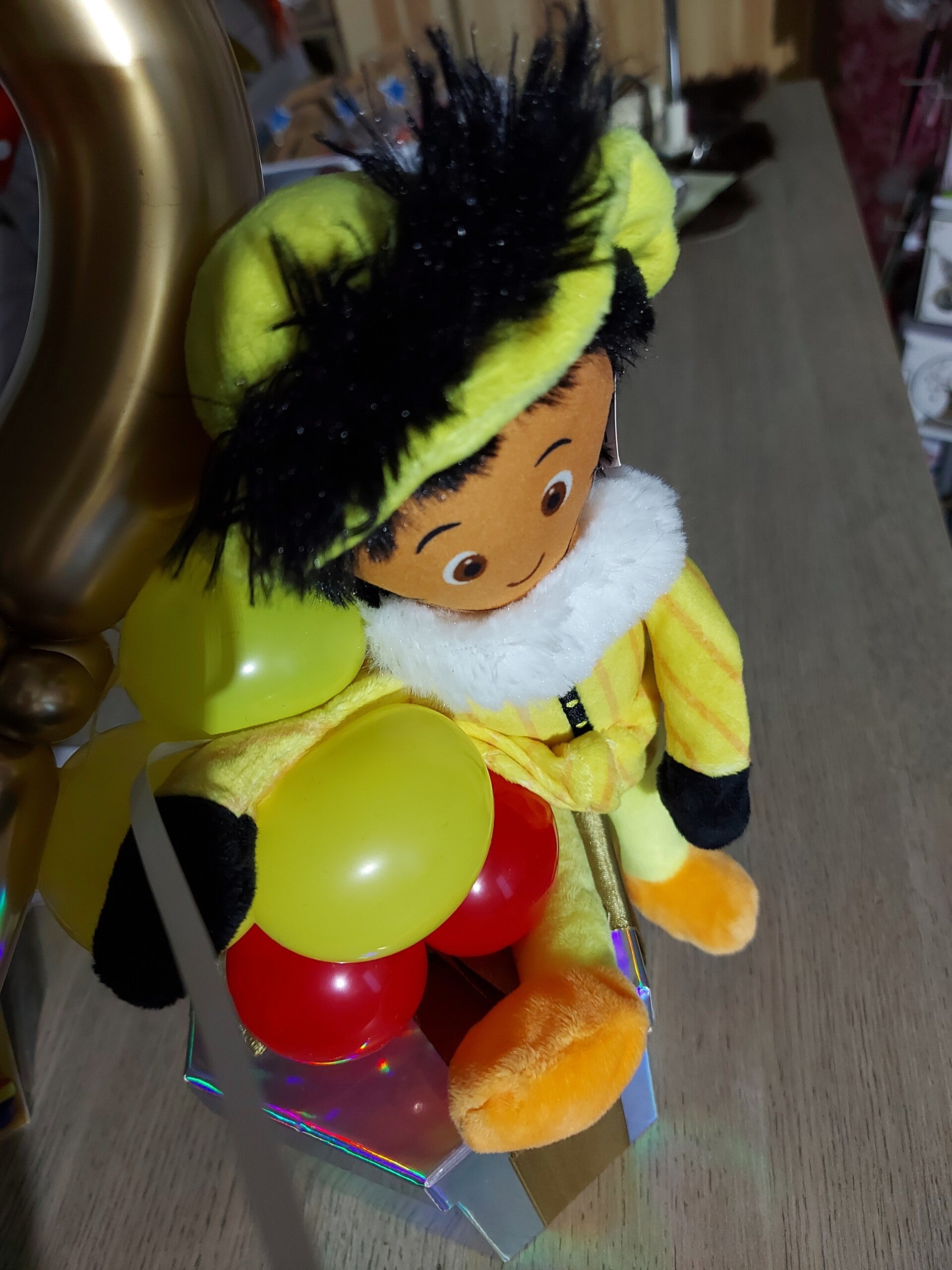 Doosje, om zelf te vullen, aan heliumballon en knuffel Piet of Sint.