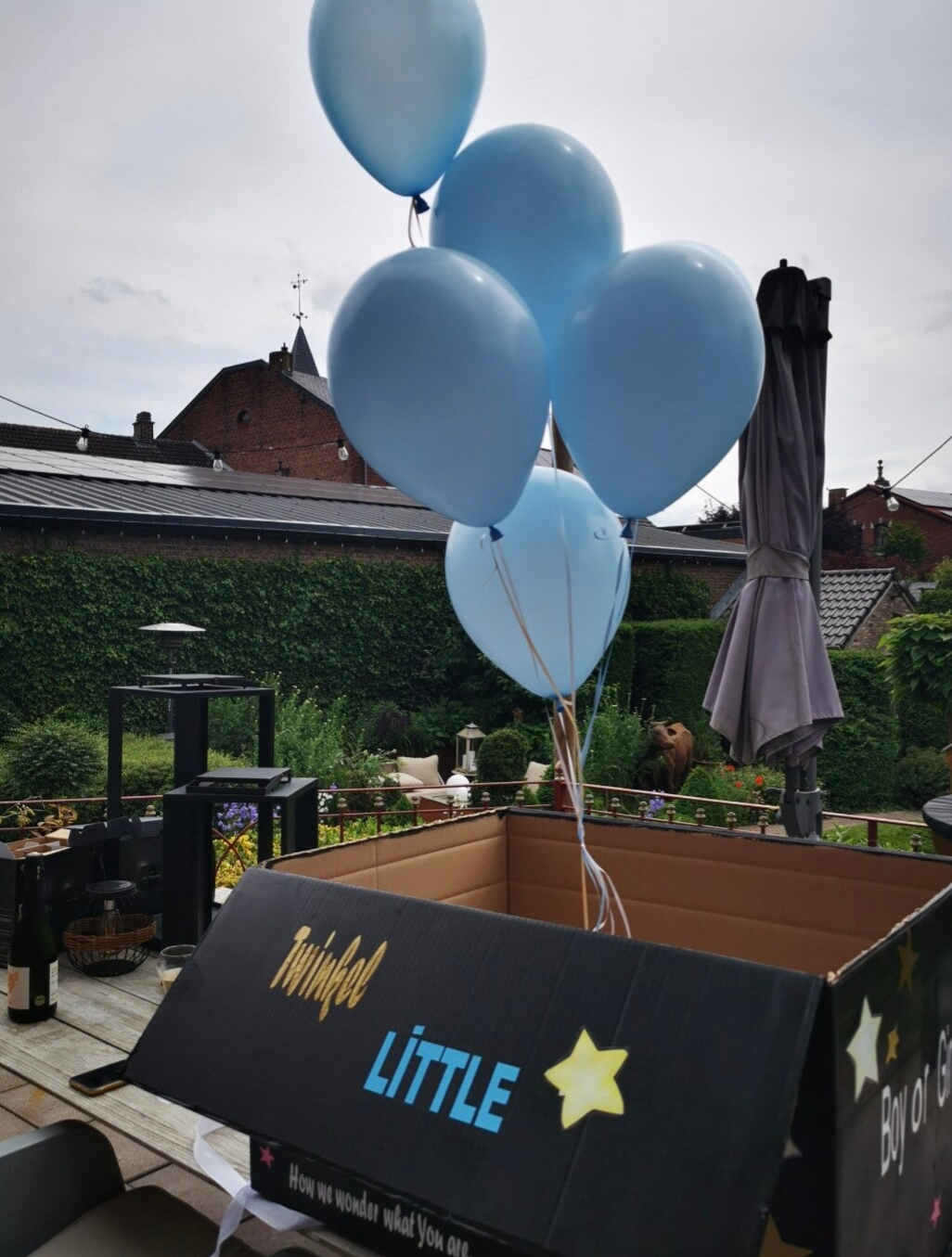 Doos met max 6 heliumballonnen in kleur van geslacht. Geplakt met vinylstickers, geplastificeerde prints...