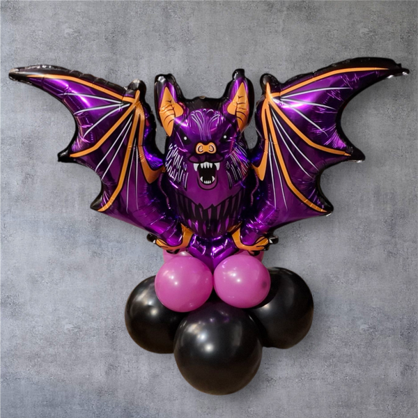 Folieballon spook en pompoen ( groter dan standaard formaat 45 cm!) met 4 latex ballonnen. Dit aan ballonblok met vleermuis.