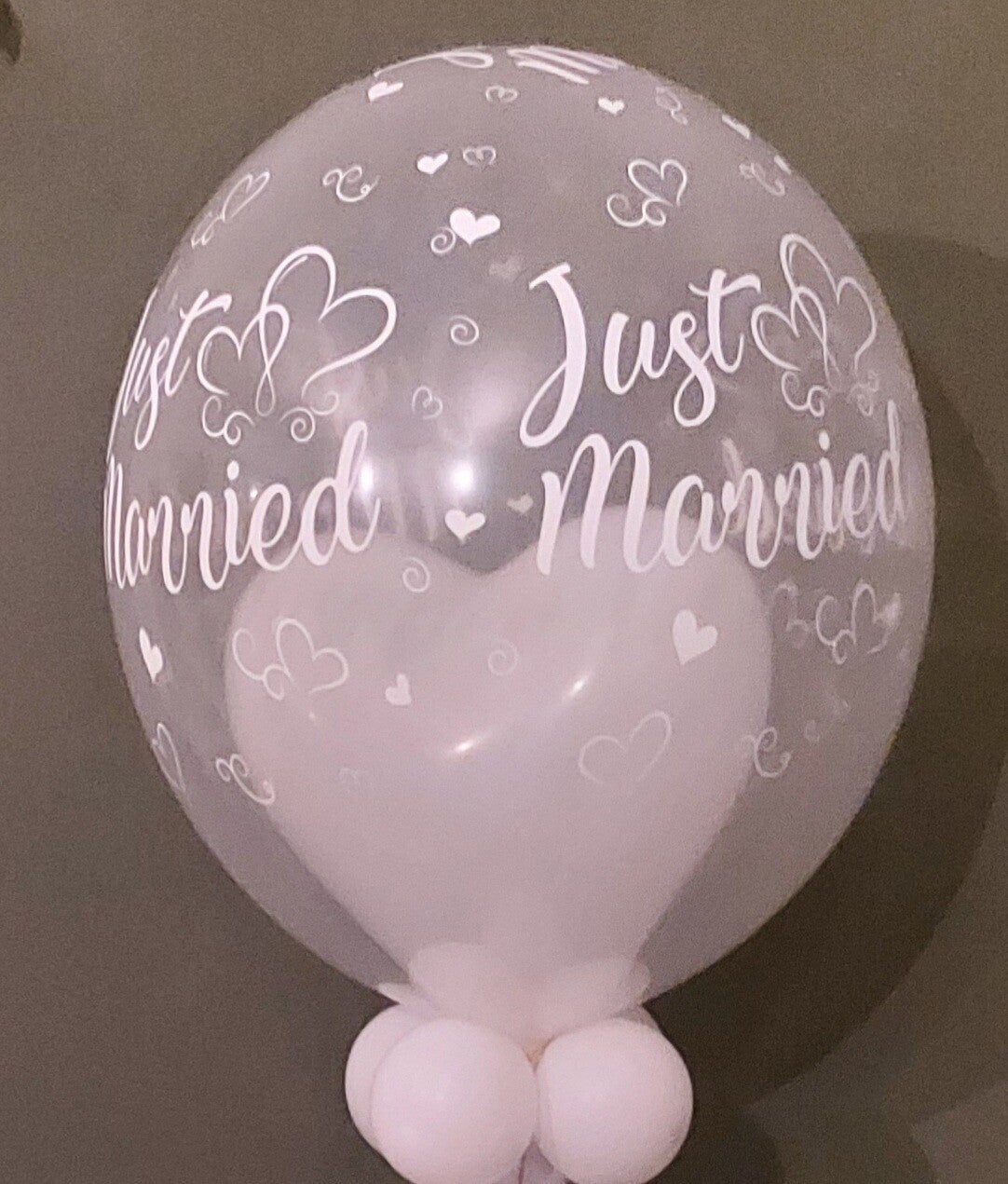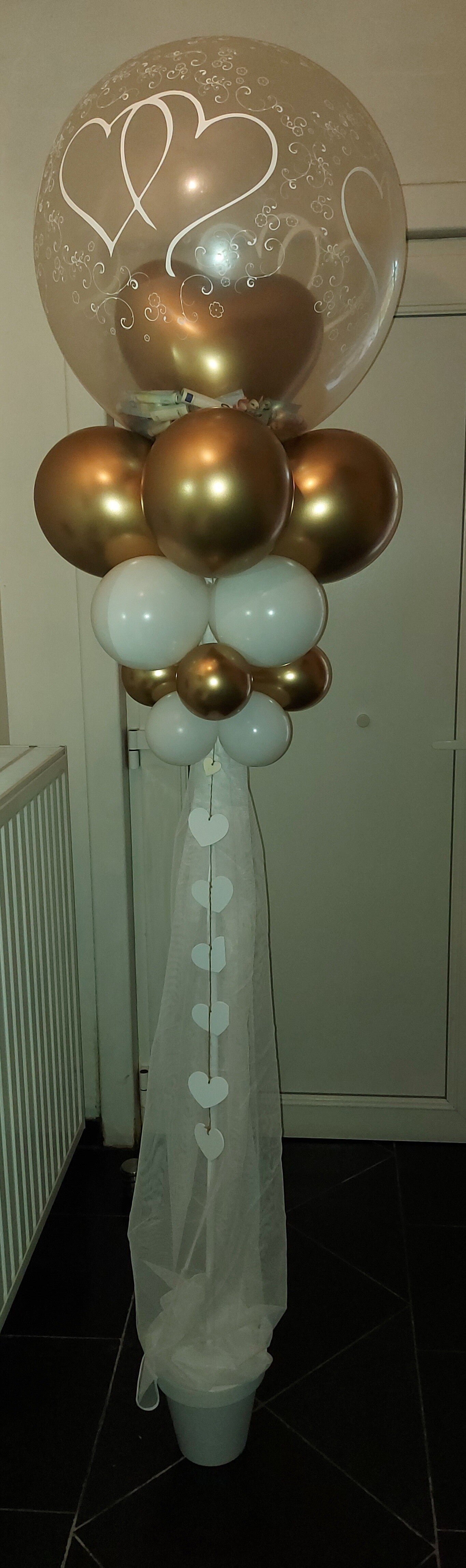 Pilaar van ongeveer 1m80, topballon 50 cm. Pilaar opgevuld met voile en hartslinger.