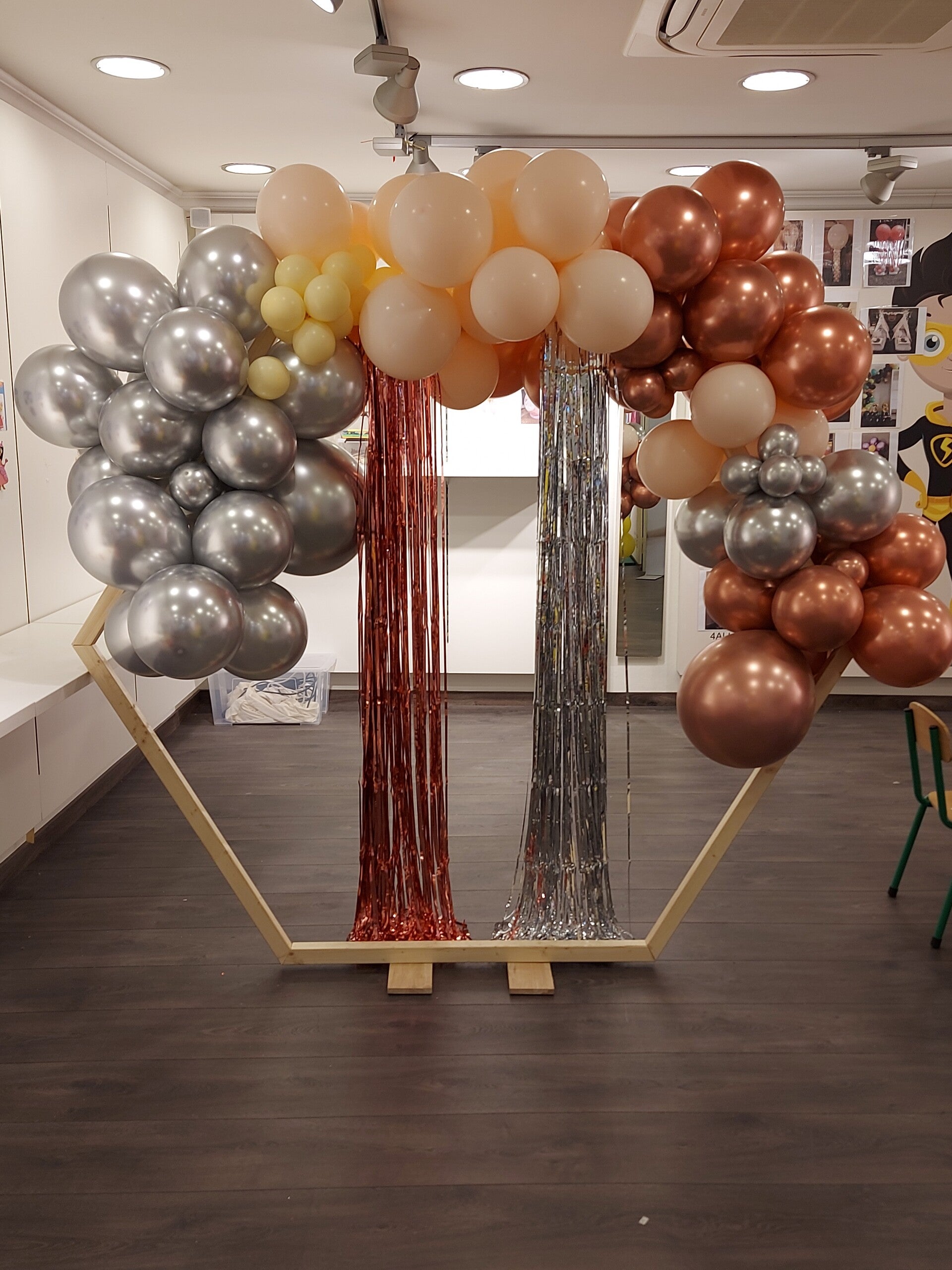 Ongeveer 3,5 meter, chrome en cream balloons. Twee slingergordijnen en huur arche incl.