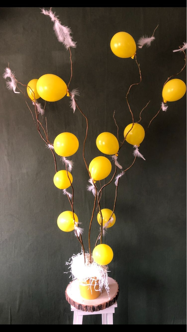 Bloempotje met Paastakken en ballonnen en Paasei, ongevuld ( 17,50 euro)of gevuld met 30 paaseitjes ( 21 euro).