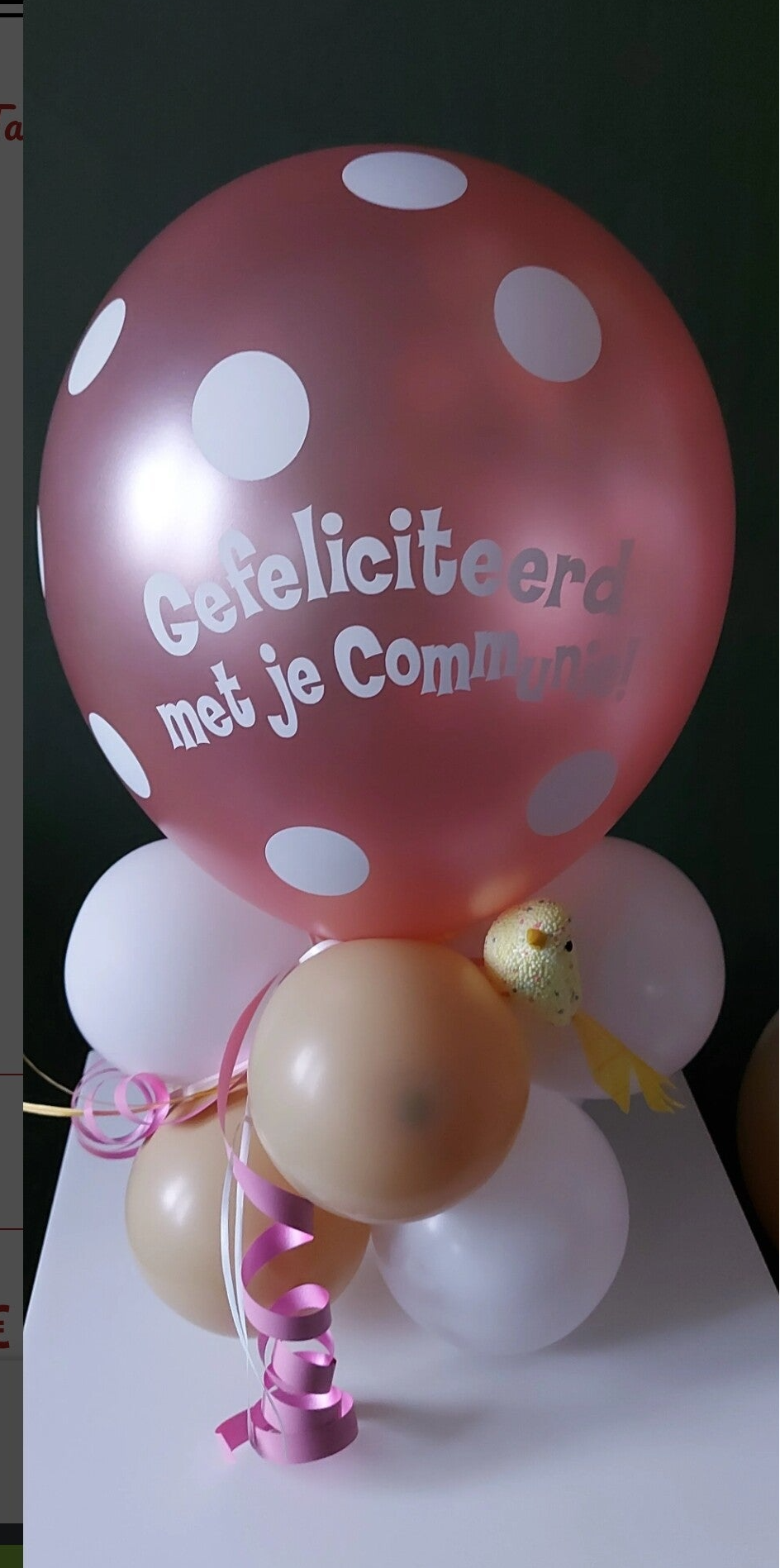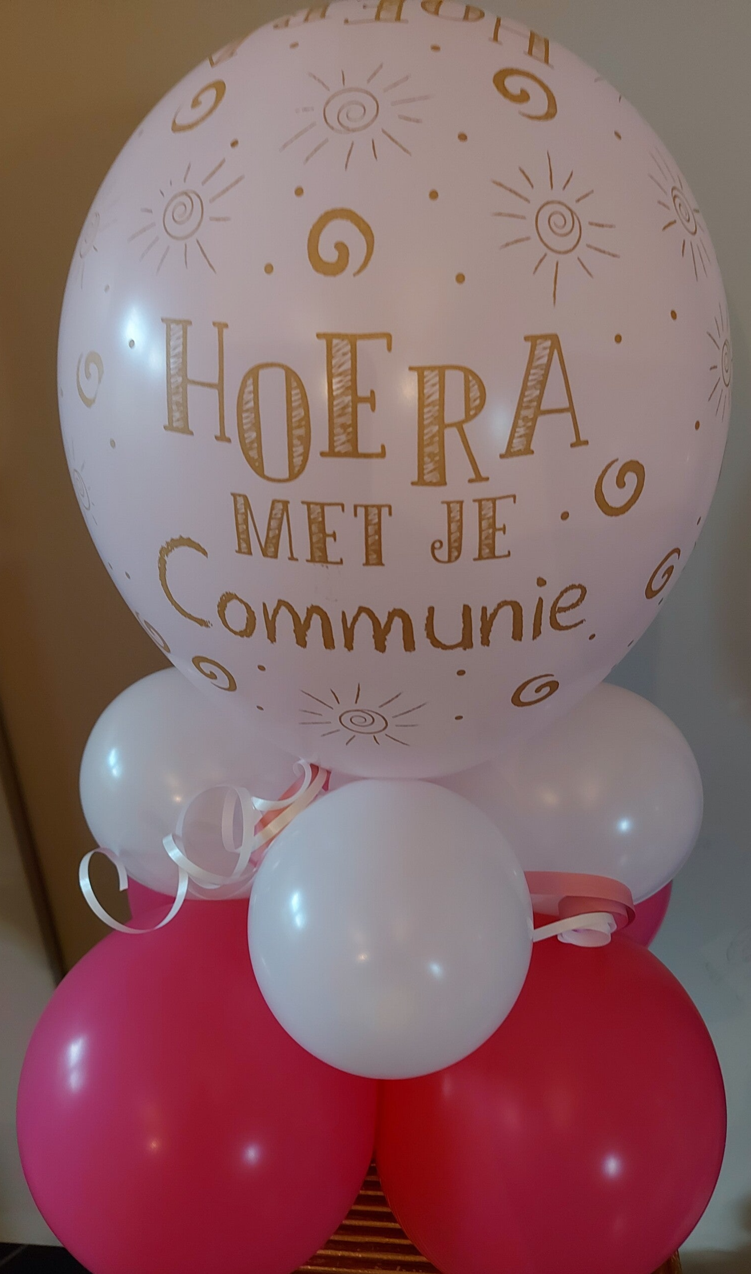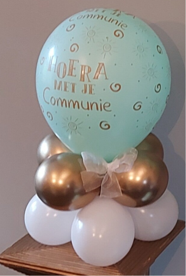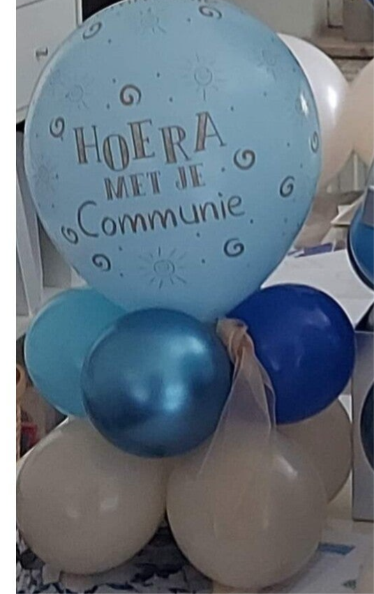 Opdruk" hoera met je communie". Kleur opgeven in opmerkingen. Denk aan de plaats op de feesttafel. Graag bij vermelden indien het kleine tafelstukjes moeten zijn van 5" ballonnen.