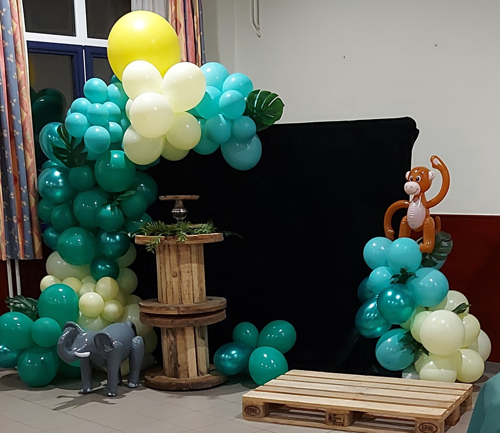 4 meter ballonnen slinger en ongeveer 1 meter extra stand aap. Bevestiging aan statief ( wand) te bevragen. Dieren exclusief prijs.